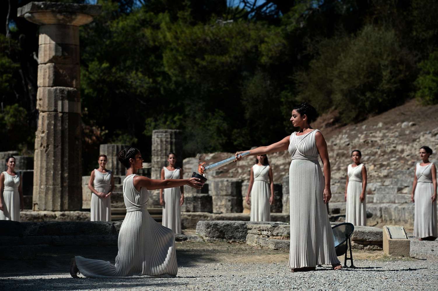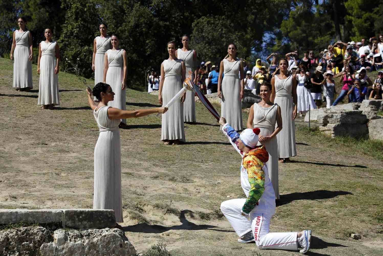 Огонь зажгли в воскресенье, а в субботу по традиции состоялась генеральная репетиция. Все шло отлично: выступавшая в роли верховной жрицы актриса Инно Менегаки справилась с прометеевой задачей добычи огня за считанные секунды, красиво принеся его из храма Геры на стадион – в окружении других жриц и юношей, изображающих атлетов. Там все они исполнили изящную хореографическую композицию, и настала пора передачи священного огня непосредственно участникам сочинской эстафеты.