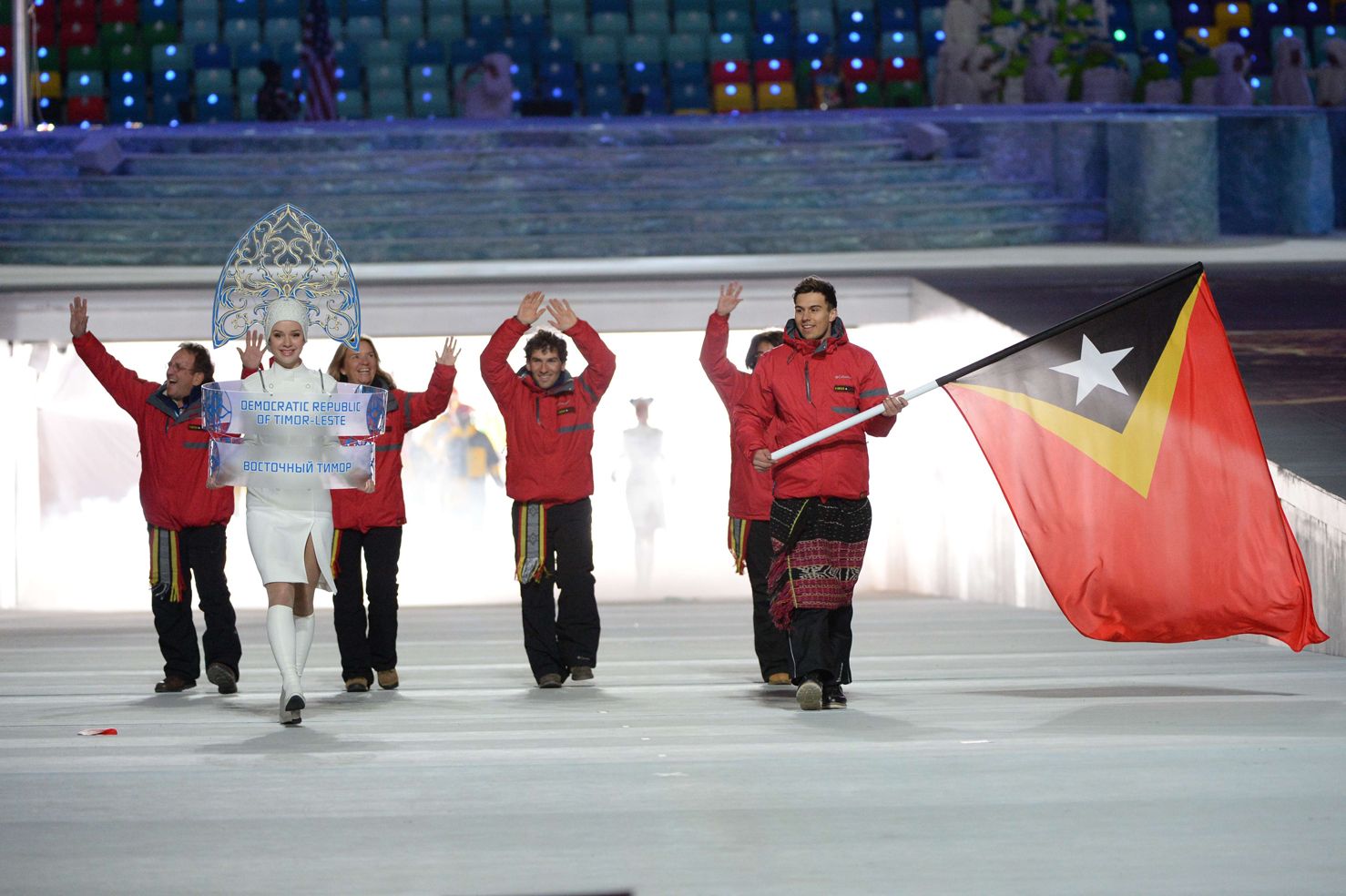 Восточный Тимор. Знаменосец этого, опять же островного государства вышел в традиционной юбке-саронге, но под низ зачем-то надел брюки. Смелее надо, тиморовцы!