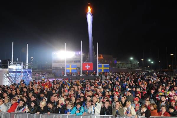 Ближе к восьми вечера круговое движение болельщиков превращается в центростремительное. Если концерт, предваряющий церемонию награждения, у сцены слушает пара тысяч человек, то к награждению толпа вырастает раз в пять. Уже находят своих обладателей первые медали, а люди все текут и текут. Каждый призер получает свою порцию аплодисментов и возгласов, а российские – двойную или даже тройную.