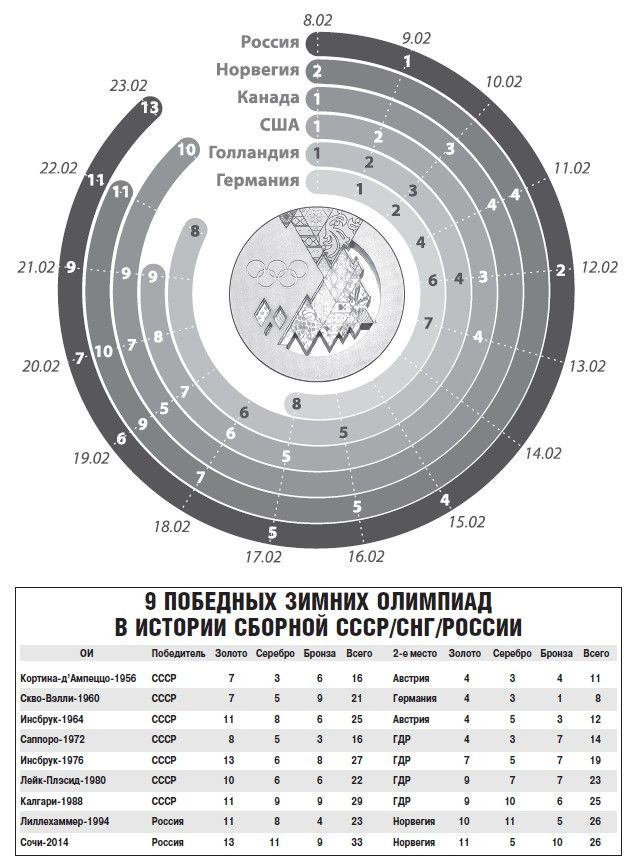 Что же касается спорта... Ох... Ах... Ух! Давайте вволю наиграемся в придумывание новых имен Виталию Мутко, уже нареченному Медалием. И поклонимся людям, умеющим делать что-то чуть ли не подзабытое: работать. Тем, кто превратил для нас эти Игры в подлинно домашние. Залил и отшлифовал ласковый для России санно-бобслейный желоб. Проложил изученные нами до сантиметра снежные трассы. Применил точные до миллиграмма мази и парафины. Сделал нашими совсем не наши в Ванкувере коньки и полозья. Наконец, добыл победы ценою гигантского куска самого себя, бросив его на олимпийский алтарь.