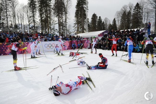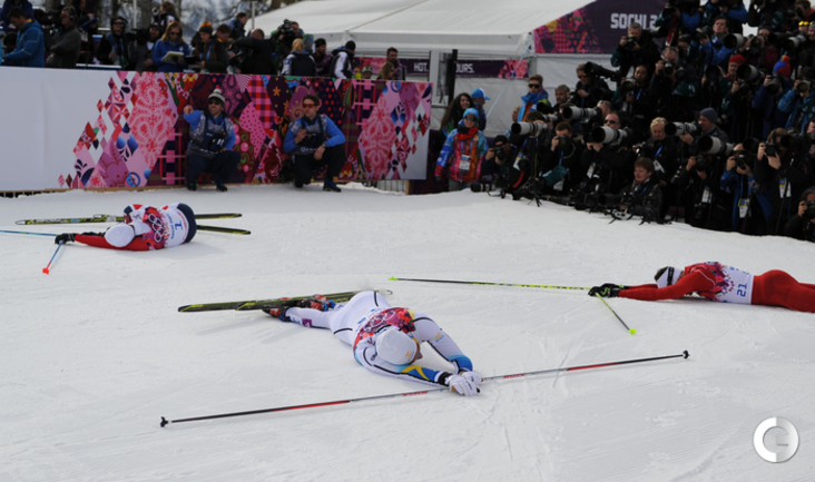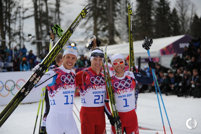 Лыжи. Сочи. Зимние Олимпийские игры. Мужчины. Скиатлон, 15+15 км. 1. Дар. Колонья (Швейцария) – 1:08.15,4. 2. Хельнер (Швеция) – отставание 0,4. 3. Суннбю (Норвегия) – 1,4. 4. ВЫЛЕГЖАНИН (Россия) – 1,5. 5. И. ЧЕРНОУСОВ (Россия) – 13,6. Старший тренер дистанционной сборной России Олег Перевозчиков сообщил, что национальная команда подала протест на результат мужского скиатлона. Основанием для протеста стал тот факт, что на финише гонки завоевавший бронзу норвежец Мартин Йонсруд Суннбю преградил дорогу россиянину Максиму Вылегжанину, который стал четвертым. Фото - Федор УСПЕНСКИЙ, "СЭ"