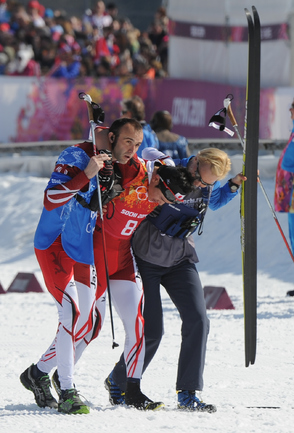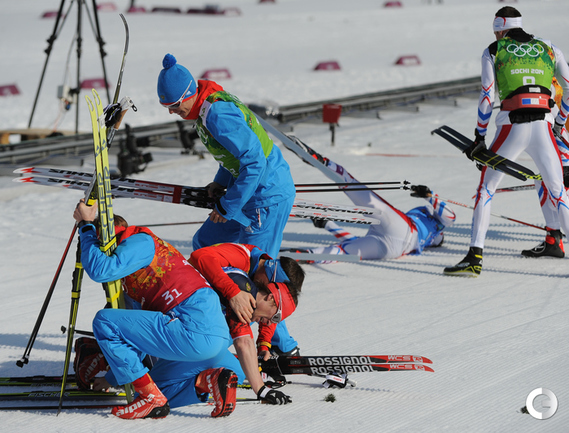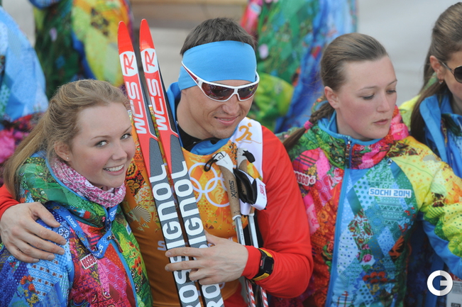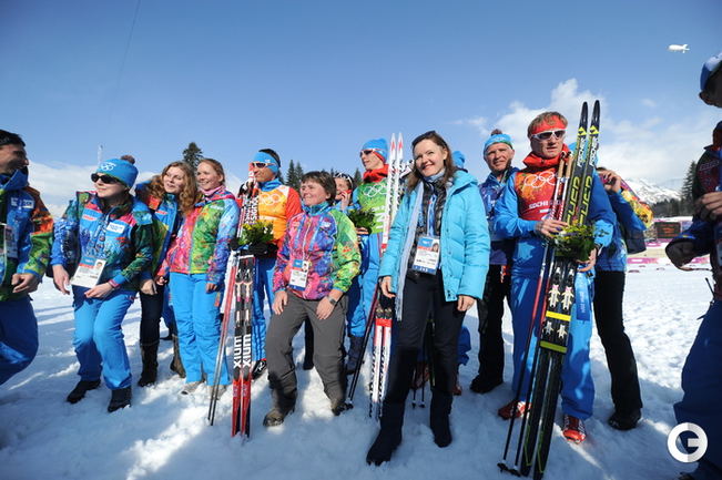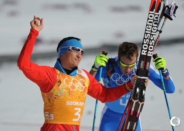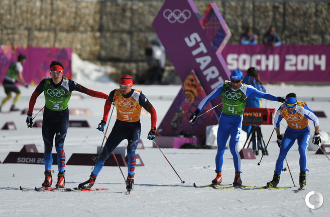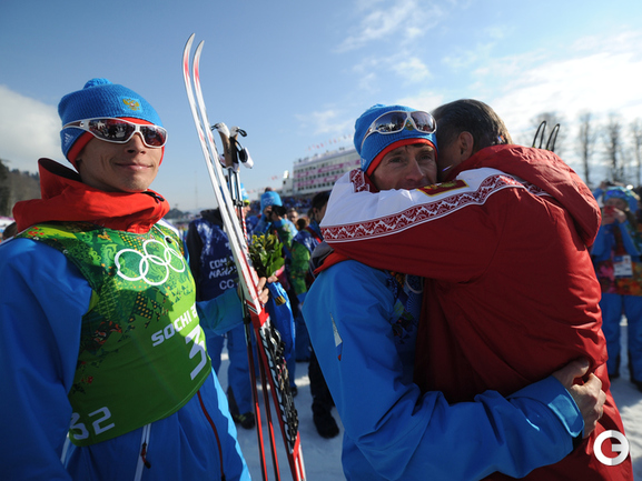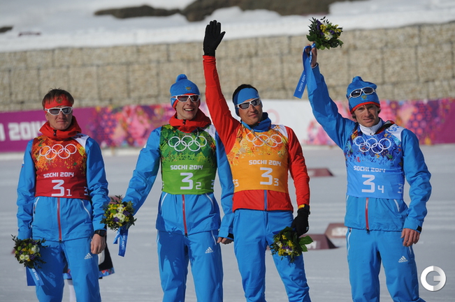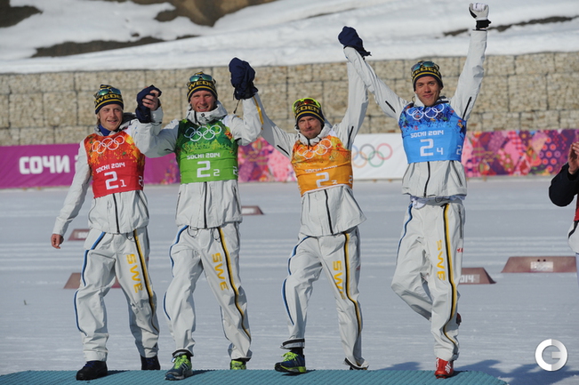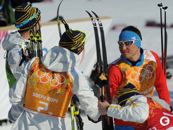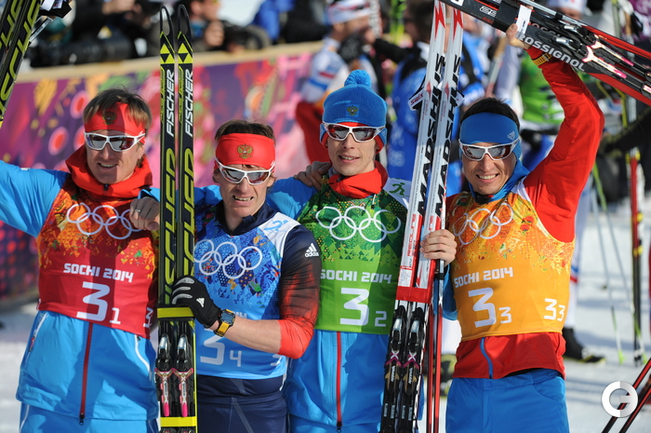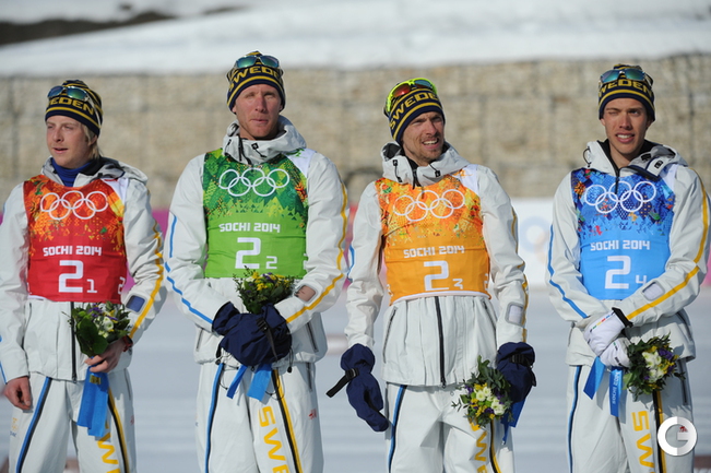 Сочи. XXII Олимпийские зимние игры. Мужчины. Сборная России (Дмитрий Япаров, Александр Бессмертных, Александр Легков и Максим Вылегжанин) завоевала серебро Олимпиады в Сочи в эстафете 4 x 10 км, проиграв лишь соперникам из Швеции. Фото - Федор УСПЕНСКИЙ, "СЭ"