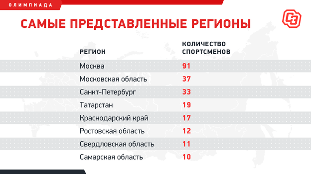 Что касается регионов, Россия представлена довольно богато — хотя была бы еще богаче, если бы спортсмены не меняли прописку после переезда в Москву, Подмосковье или Петербург. Столица занимает почти треть сборной (91 человек). Всего в сборной России представлено 49 субъектов из 85, а с учетом параллельных зачетов — 56. Но нет значимого числа заметных регионов — например, 2,5-миллионного Пермского края или Белгородской области. Самый маленький регион с представительством — Севастополь.