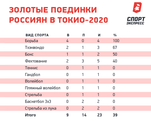 Попробуем взглянуть на ситуацию шире, подключив те виды спорта, где в принципе есть золотые финальные поединки. Таких в Токио с участием россиян было 18 (помимо шести неудачных финалов игровиков). В одном из них опять случилось российское дерби — в титульном поединке в женской сабле сошлись София Позднякова и Софья Великая. Вынесем этот бой за скобки. В остальных счет намного бодрее — 9:8 в пользу россиян (9:14, если вместе с игровиками). Правда, тут есть важный фактор наших борцов. В вольной и греко-римской борьбе наши спортсмены выиграли все четыре свои золотые схватки. Если без борцов, но с игровиками, счет получается 5:14 — всего 26 процентов побед. В общем, тут смотря как считать. Но в целом неудач в решающий момент было действительно много.