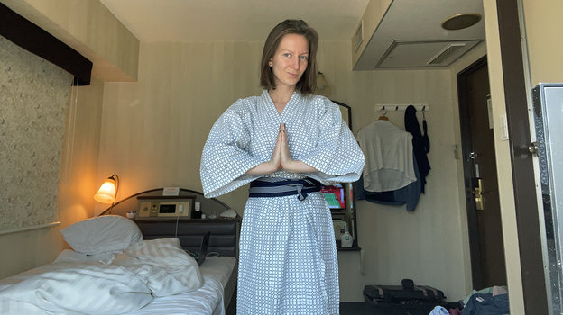 Пытаюсь замаскироваться в японку, чтобы беспрепятственно выходить из отеля. Вместо кимоно нам выдали халаты, так что задача не самая сложная. Да и как-то развлекать себя надо, пока мой вопрос еще не решен.