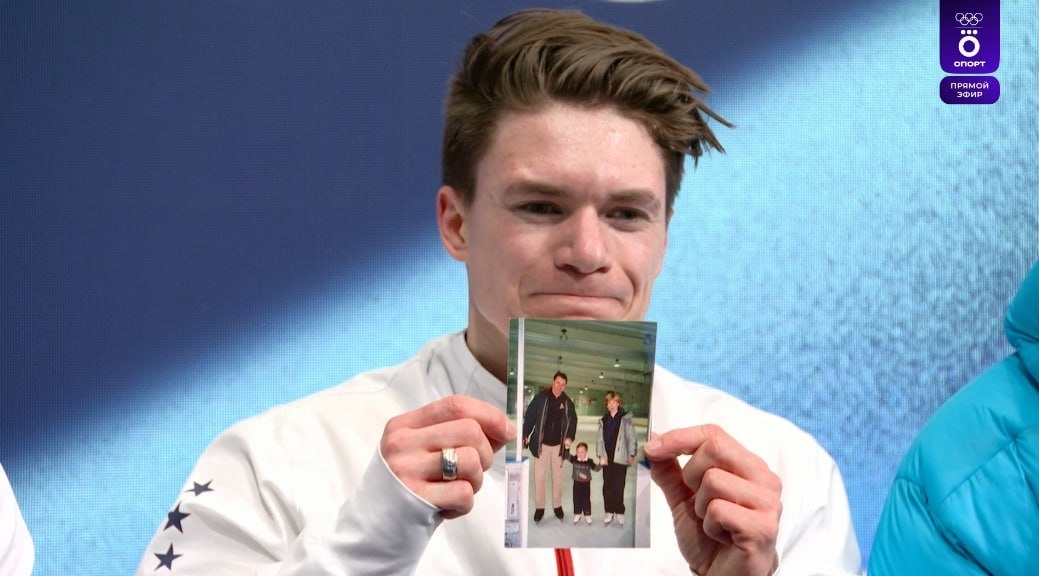 Фигурист Максим Наумов, представляющий США, показал фотографию своих родителей после выступления в короткой программе на Олимпиаде-2026.