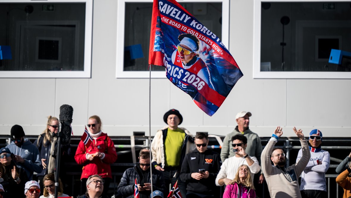Болельщики с флагом России пришли поддержать лыжника Савелия Коростелева на Олимпиаде.