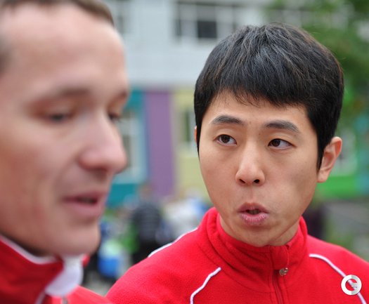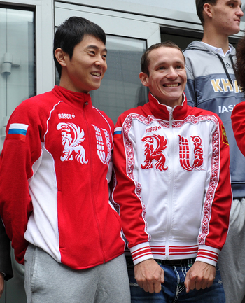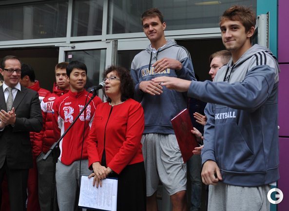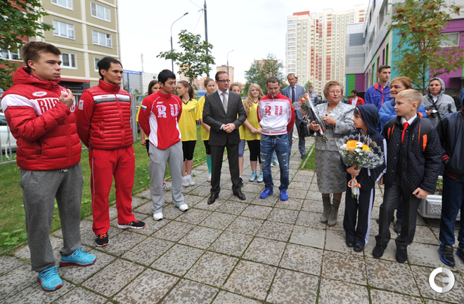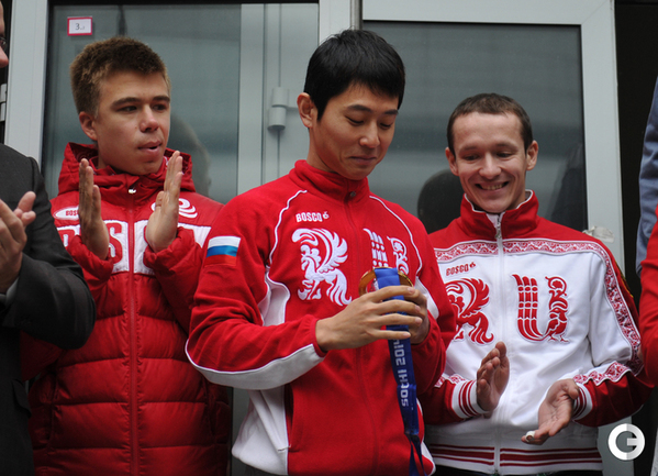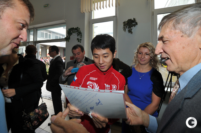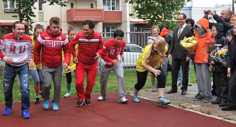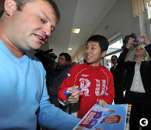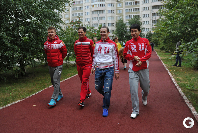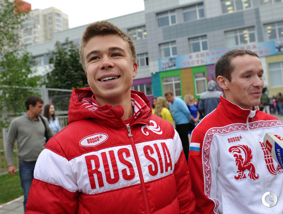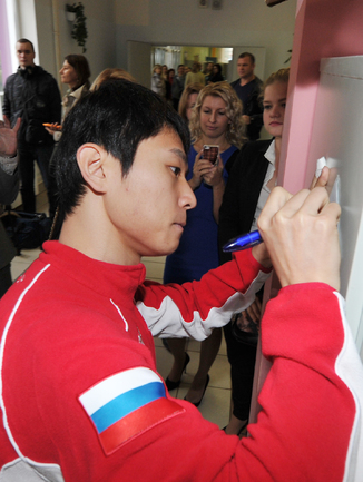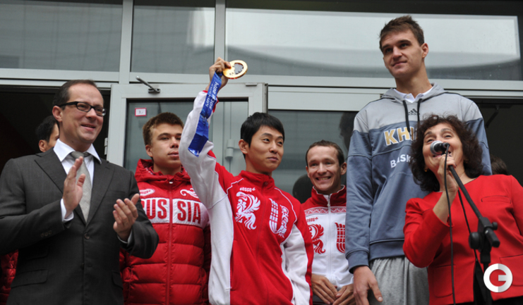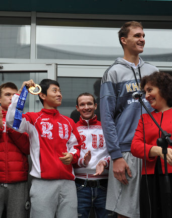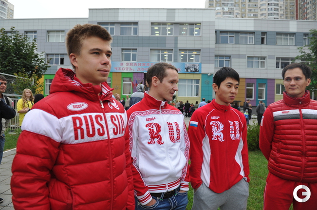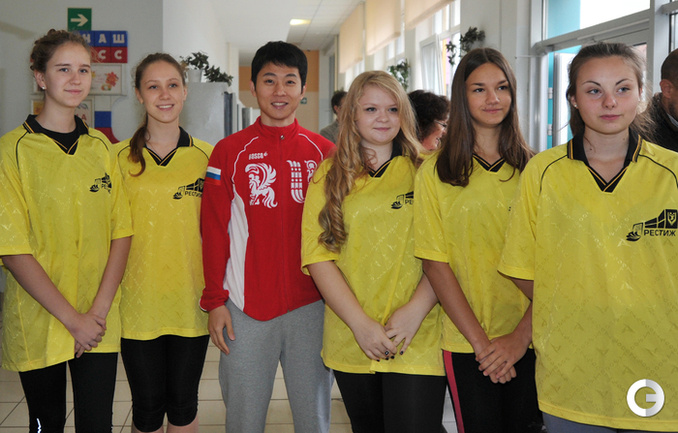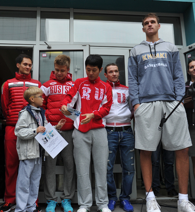 Олимпийские чемпионы по шорт-треку Виктор Ан, Семен Елистратов, Владимир Григорьев и Руслан Захаров вместе с баскетболистами молодежного состава БК "Химки" провели открытый урок в школе №25 подмосковных Химок. Фото - Александр Федоров, "СЭ"