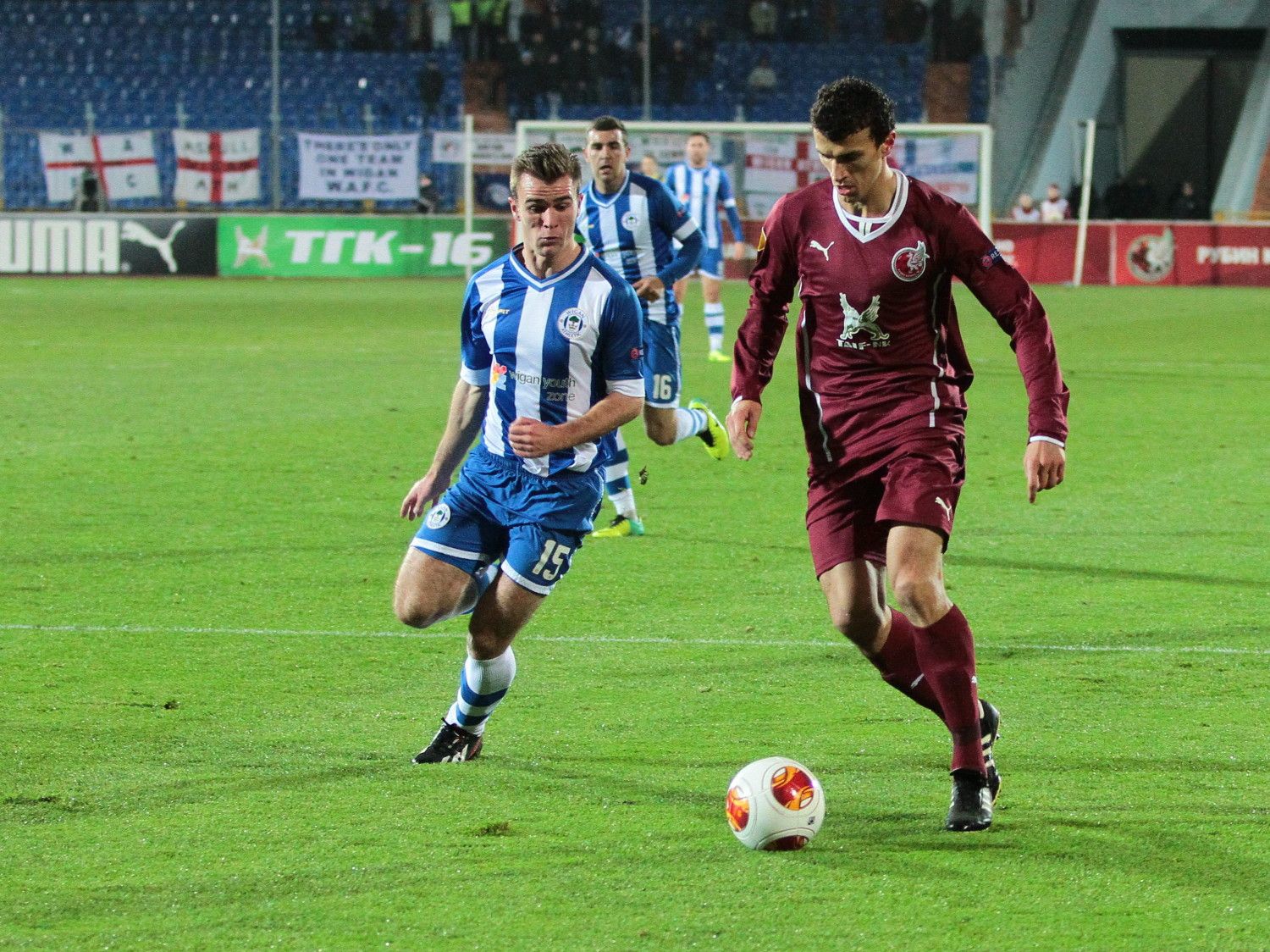 "Рубин" в домашнем матче 4-го тура группового турнира Лиги Европы выиграл у "Уигана" с минимальным счетом (1:0). Единственный гол на 22-й минуте встречи забил Олег Кузьмин. Эта победа гарантировала казанской команде путевку в плей-офф турнира.