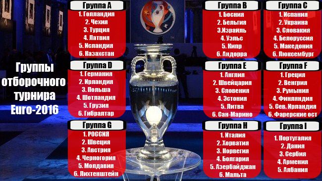 В Ницце состоялась жеребьевка квалификации Euro-2016. В отборочном цикле впервые сыграют 53 сборные (дебют ждет команду Гибралтара): девять победителей групп, девять обладателей вторых мест и лучшая третья команда попадут в финальную стадию напрямую. Восемь других обладателей третьих мест в стыковых поединках решат судьбу оставшихся четырех путевок на Euro, где на этот раз сыграют 24 команды. Полный состав групп выглядит следующим образом: