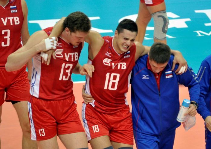 Травмированный Павел МОРОЗ (№ 18) покидает площадку при помощи Дмитрия МУСЭРСКОГО. Фото - fivb.org