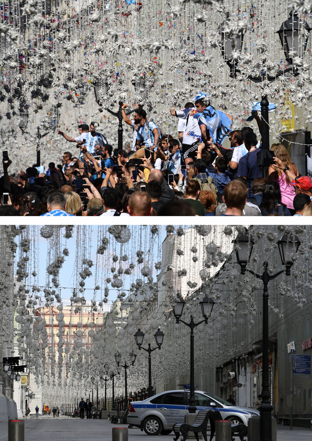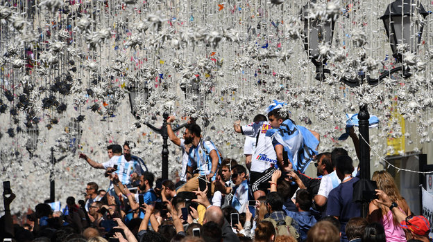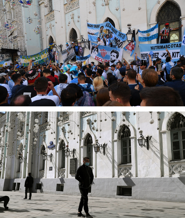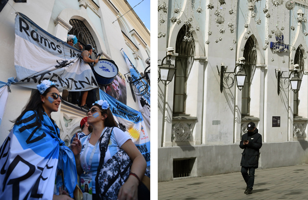 Аргентинские фанаты удачно выбрали здание Синодальной типографии на Никольской в качестве своей базы. Небесно-голубые цвета фасада — великолепный фон для бело-голубых флагов «альбиселесте».