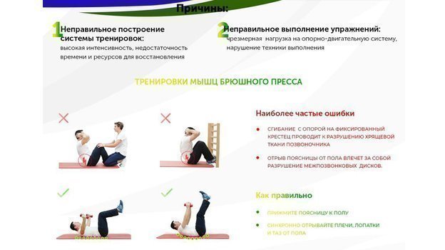 Например, при тренировках брюшного пресса категорически противопоказаны сгибание с опорой на фиксированный крестец и отрыв поясницы от пола. Наоборот, ее нужно прижимать к полу, синхронно отрывать плечи, лопатки и таз. А когда тренируешь спину, излишнее разгибание в пояснице приводят к перенапряжению мышц и травмам связочного аппарата позвоночника.