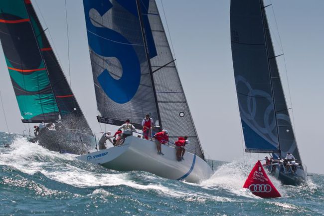 На самом же деле наша команда должна была финишировать в субботней гонке третьей. Уверенность в этом строилась на том, что значительную ее часть "Синергия" шла именно на этой позиции. Ran захватила лидерство практически с самого старта, в этот же момент выдвинулась на вторую позицию и Quantum. "Синергия" тоже вошла на старте в лидирующую группу, но уже на втором знаке отступила на седьмую позицию. Впоследствии российский экипаж отыгрался и на длинный заключительный отрезок дистанции ушел третьим с отставанием в 22 секунды от лидера Ran, с успехом отбиваясь от возможных атак Audi Azzurra. Увы, но, контролируя позицию итальянцев, в какой-то момент россияне отпустили их. Соперники, воспользовавшись свободой, нашли ветер, сами выдвинулись вперед и выиграли у россиян 18 секунд на финише.