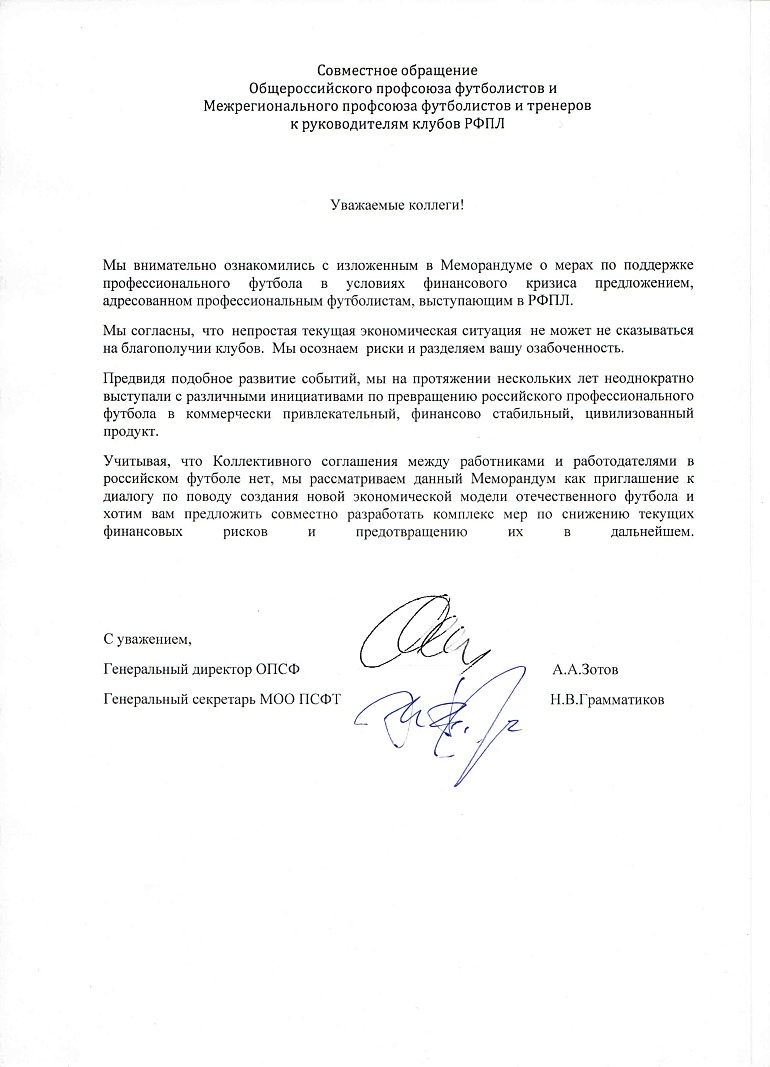 Общероссийский профсоюз футболистов готов обсудить Меморандум о мерах по поддержке профессионального футбола в условиях финансового кризиса, информирует официальный сайт организации. 25 декабря подписан документ, с которым клубы премьер-лиги обратятся к игрокам и агентам с просьбой зафиксировать единый курс валют в условиях нестабильной финансовой ситуации в России – 45 рублей за доллар и 55 – за евро.