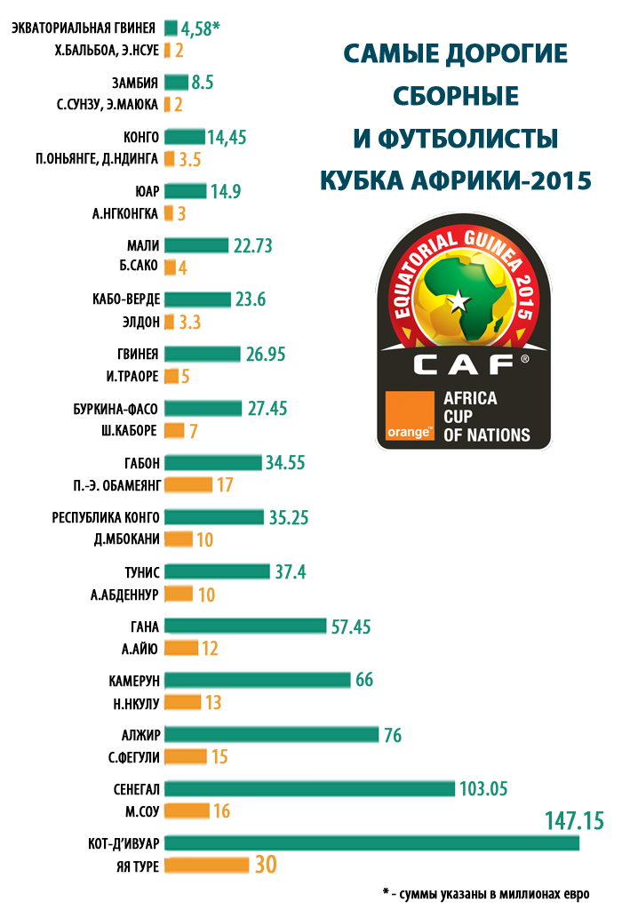 Сегодня в Экваториальной Гвинее стартует 30-й розыгрыш Кубка африканских наций. Самым дорогим составом на турнире (по версии немецкого портала transfermarkt.de) располагает один из главных фаворитов – Кот-д'Ивуар (147,15 миллиона евро), самым дешевым – хозяева Кубка (4,85 млн евро). Напомним, что турнир должен был проходить в Марокко, но в октябре власти Королевства отказались от его проведения в связи с эпидемией лихорадки Эбола в Западной Африке.