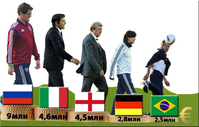 Третьим в списке идет Рой Ходжсон. В Англии, обжегшись на том же Капелло, продолжают делать ставку на дедушку, но теперь уже своего, британского. И снова есть вопросы: в Бразилии англичане сыграли, мягко говоря, не важно, а заработок у 67-летнего Ходжсона очень и очень внушительный.