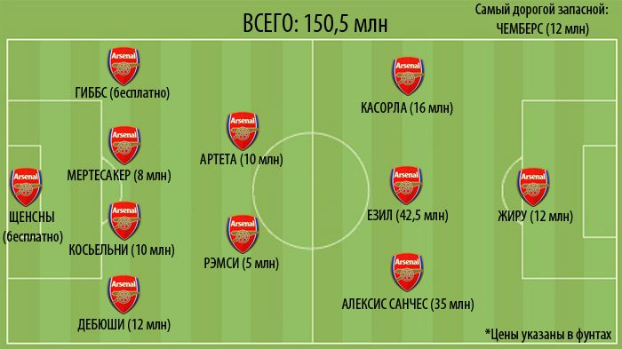 В распоряжении Венгера все еще Войцех Щенсны и Киран Гиббс, которые ничего не стоили. При этом Джек Уилшир окажется на скамейке, если все игроки здоровы. Но только три игрока в первых 11 (два вышеупомянутых, а также Санти Касорла) стоят более 15 миллионов, что является впечатляющим показателем. Даже английский квартет Дэнни Уэлбек (16 миллионов), Калум Чемберс (16 миллионов), Тео Уолкотт (12 миллионов) и Алекс Окслейд-Чемберлен (12 миллионов) не попадет в этот список.