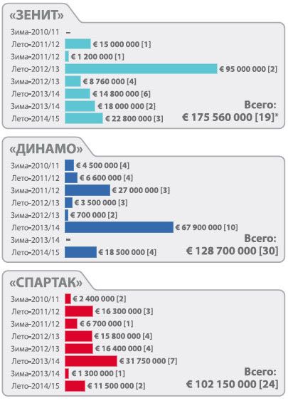 Суммы, пусть и в большинстве своем неофициальные, поражают воображение. За Кокорина, Денисова, Жиркова, Самба, Габулова и Ионова "Динамо" заплатило 67 миллионов евро. "Локомотив" за Диарра, Буссуфа и Логашова отдал 30 миллионов. Прибавьте сюда еще 750 тысяч, которые "Спартак" выложил за Жоау Карлоса. В итоге получается без малого 98 миллионов евро – 97,75!