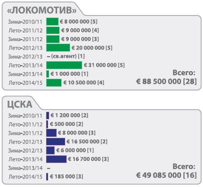 Добавим сюда еще несколько индивидуальных клубных случаев, которые также повлияли на общую картину. Так, прошлым летом обычно рачительный в своих тратах ЦСКА раскошелился аж на 16,7 миллиона евро, подписав Витинью, Миланова и Цубера. При том что в нынешнем году армейцам удалось заполучить всех нужных футболистов фактически бесплатно – 200 тысяч компенсации за Панченко не в счет. Но, вполне вероятно, будущим летом красно-синие вновь будут покупать футболистов за живые деньги, а не заключать контракты со свободными агентами.