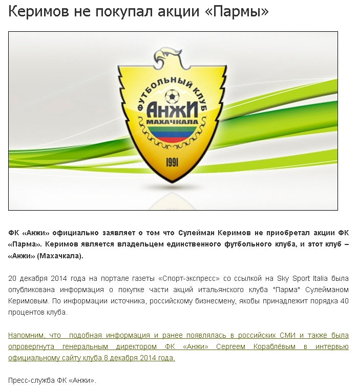 "ФК "Анжи" официально заявляет о том, что Сулейман Керимов не приобретал акции ФК "Парма". Керимов является владельцем единственного футбольного клуба, и этот клуб – "Анжи" (Махачкала)".