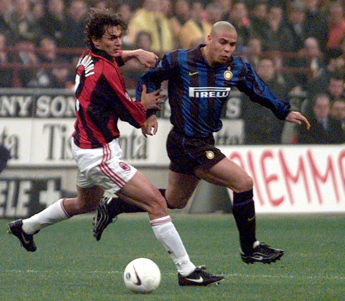 1999 год. Будущие легенды "Милана" - Паоло МАЛЬДИНИ (слева) - и "Интера" - РОНАЛДО - в дерби на "Сан-Сиро". Фото REUTERS