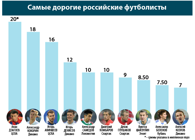 "СЭ" на основе данных transfermarkt.de составил рейтинг самых дорогих футболистов России.