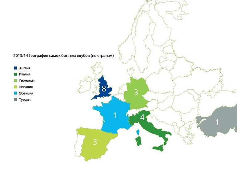 Наконец, не нашлось места в рейтинге (и это, увы, традиционно) российским клубам. География же двадцати самых доходных клубов по странам выглядит следующим образом.