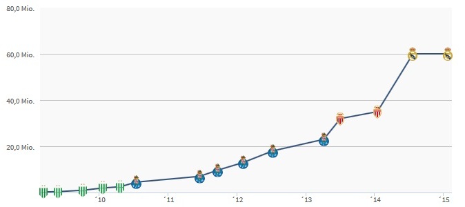 Как менялась трансферная стоимость Хамеса Родригеса по версии transfermarkt.de