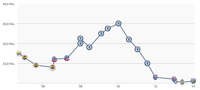 Как менялалась трансферная стоимость Златана Ибрагимовича по версии transfermarkt.de