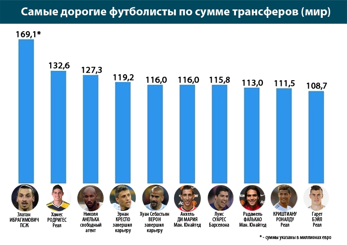 Пожалуй, нет ничего удивительного в том, что именно шведский нападающий Златан Ибрагимович, получивший в Италии прозвище Цыган (тиффози припомнили ему балканские корни и любовь к смене футбольной прописки), занимает первую строку в списке самых дорогих игроков в мире по сумме, которую клубы в общей сложности отдали за его трансферы. "Аякс" (7,8 миллиона евро), "Ювентус" (16), "Интер" (24,8), "Барселона" (69,5), "Милан" (30) и "ПСЖ" (21) в разные годы вместе потратили на покупку форварда 169,1 миллиона евро.