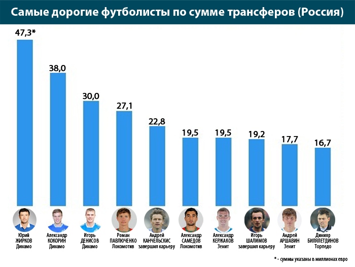 Подобно Жиркову, еще четыре футболиста из топа российского списка выступали в английской премьер-лиге, что значительно увеличило общую сумму их трансферов. Это нападающий "Локомотива" Роман Павлюченко, выступавший за "Тоттенхэм" (27,1 миллиона евро). Экс-хавбек Андрей Канчельскис, защищавший в разные года цвета "Манчестер Юнайтед", "Эвертона", "Манчестер Сити" и "Саутгемптона" (22,8). Игрок атаки "Зенита" Андрей Аршавин, четыре года проведший в лондонском "Арсенале" (17,7). Наконец, хавбек "Торпедо" Динияр Билялетдинов, игравший в "Эвертоне" (16,7).