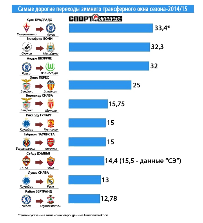 "Фиорентина" получила за Куадрадо не только сумму, ставшую рекордной этой зимой во всей Европе, но и арендовала у "Челси" яркого египтянина Мохаммеда Салаха. Стоит ли колумбиец таких денег? Без сомнений! Во Флоренции он быстро стал настоящим кумиром публики, а тосканцы толк в футболе знают, времена Батистуты еще не забыли. Куадрадо уже много раз пытались переманить – то "Бавария", то "МЮ", то "Барселона". Каталонцы были к цели ближе всех, но летом договориться не получилось, а сейчас сине-гранатовые наказаны ФИФА и новичков приобретать не могут.