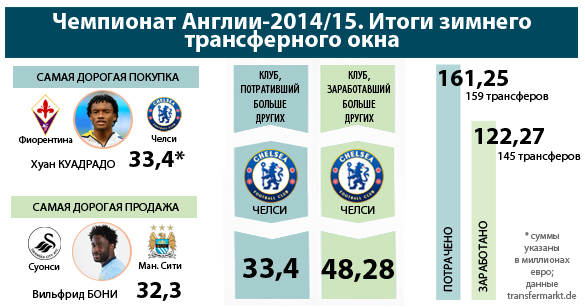 Клуб, потративший на трансферном рынке больше других - "Челси" (33,4 миллиона евро). В Англии ждали трансферных свершений от "Манчестер Юнайтед". Еще в декабре в прессе была озвучена предполагаемая сумма потенциальных покупок манкунианцев – 150 миллионов фунтов, выделенная не то на одно, не то на два ближайших дозаявочных окна. Но финансовым паровозом в итоге выступил клуб Романа Абрамовича, потративший обозначенные 33,4 миллиона на Куадрадо, а "МЮ" и вовсе не совершил ни крупной одной сделки, за исключением подписания свободного агента – испанского голкипера Виктора Вальдеса.