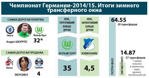 Самая дорогая покупка. "Вольфсбург" заплатил за нападающего "Челси" Андре Шюррле 32 миллиона евро. Футболист сборной Германии почти гарантированно получит место в стартовом составе (в Лондоне с этим были проблемы), а его новая команда, идущая на втором месте в бундеслиге, претендует на место в Лиге чемпионов на сезон-2015/16. Общая сумма, которую "Вольфсбург" инвестирует в покупку Шюррле, будет равняться примерно 60 миллионам евро: 32 миллиона непосредственно на трансфер и еще 5 миллионов – в качестве бонуса. Агент Шюррле, в свою очередь, получит 2 миллиона, а годовая зарплата футболиста составит 6 миллионов евро в год (контракт подписан до лета 2019 года).