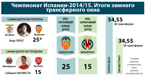Общая информация. По сравнению с прошлой зимой испанские клубы вели себя на трансферном рынке куда более активно: в 2014-м траты по покупку футболистов составили 16,25 миллиона евро, доход от продажи игроков – 12,25 миллиона евро. Таким образом, за год на испанском рынке зафиксирован колоссальный рост: 336 процентов на покупке игроков и 282 процента – на продажах. Более того, на новичков была потрачена рекордная за последние шесть лет сумма (54,55 миллиона). Цифры роста зафиксированы даже вопреки тому обстоятельству, что один из самых богатых клубов примеры, "Барселона", на весь 2015 год серьезно ограничена в трансферных сделках и не может регистрировать новых футболистов.