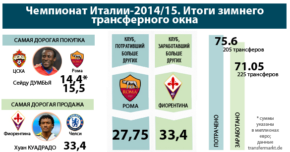 Общая информация. В итальянском футболе, в последние годы прочно ассоциируемом в сознании общественности с коррупционными скандалами и банкротствами клубов, более не совершается рекордных сделок на "вход" (самая дорогая покупка трансферного окна почти на 20 миллионов дешевле самой дорогой продажи футболиста в зарубежный чемпионат). Судите сами, зимой-2015 представители серии А потратили 75,6 миллиона на новых футболистов, зимой-2014 – 54,49 миллиона, что заметно уступает максимальному показателю зимы-2011 – 138,99 миллиона. Более того, в отношении покупок и продаж существует фактический финансовый паритет (разница всего в 4 миллиона долларов), чего невозможно представить в премьер-лиге, бундеслиге или примере. Зато итальянские клубы опережают более щедрых конкурентов по общему объему сделок (430 переходов зимой-2015), правда львиная доля трансферов приходится на аренду игроков.