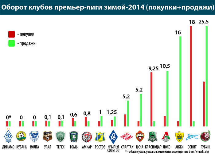 Самыми активными покупатели зимы-2014 стали "Анжи", оказавшийся в роли главного аутсайдера премьер-лиги, и "Рубин", впервые почти за полтора десятка лет сменивший главного тренера. Оба клуба подписали по 11 футболистов.