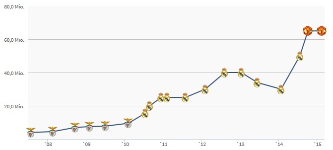 Как менялась трансферная стоимость Анхеля Ди Марии по версии transfermarkt.de