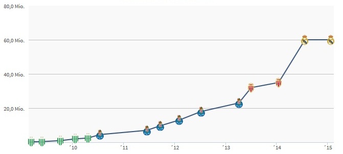 Как менялась трансферная стоимость Хамеса Родригеса по версии transfermarkt.de
