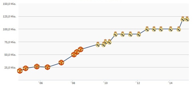 Как менялась трансферная стоимость Криштиану Роналду по версии transfermarkt.de