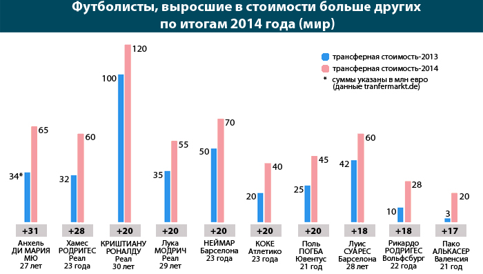 Четыре первых футболиста списка transfermarkt.de провели сезон (или его часть) в составе "Королевского клуба": Криштиану Роналду, Лука Модрич и Анхель Ди Мария в конце мая 2014 года вместе с "Реалом" стали победителями Лиги чемпионов (летом аргентинец Ди Мария покинул клуб и перешел в "Манчестер Юнайтед"), а Хамес Родригес присоединился к мадридцам уже после окончания чемпионата мира в Бразилии.
