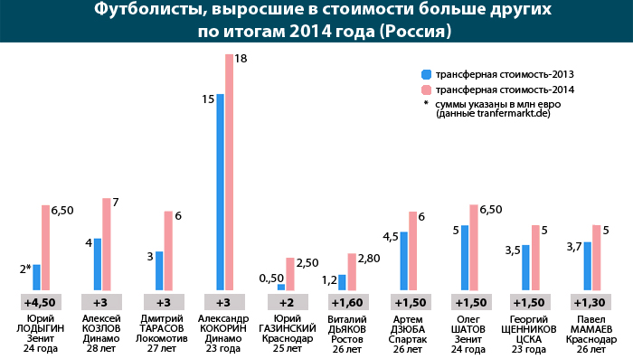 А вот третье место в списке досталось футболисту, не попавшему в заявку Фабио Капелло на чемпионат мира в Бразилии - полузащитнику "Локомотива" Дмитрию Тарасову. 27-летнего футболиста целый год преследуют травмы, и в 2014 году он появился на поле лишь в шести матчах (последний раз - 28 августа в ответной игре 4-го отборочного раунда Лиги Европы). При этом трансферная стоимость футболиста… выросла на 3 миллиона евро (до 6 миллионов)!