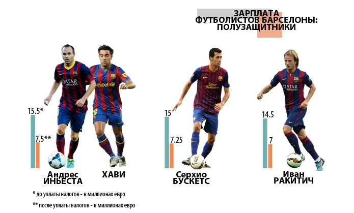 Рядом с Бускетсом расположились другие полузащитники стартовой обоймы сине-гранатовых: оклад Андреса Иньесты и капитана команды Хави составляет 15,5 миллиона евро или 7,5 миллиона после уплаты налогов (контакт экс-хавбека сборной Испании истекает в 2016 году и уже ближайшим летом он может сменить клубную прописку), а хорватский новобранец Иван Ракитич, перебравшийся летом на "Ноу Камп" из "Севильи", зарабатывает 14,5 миллиона евро (7 "чистыми").