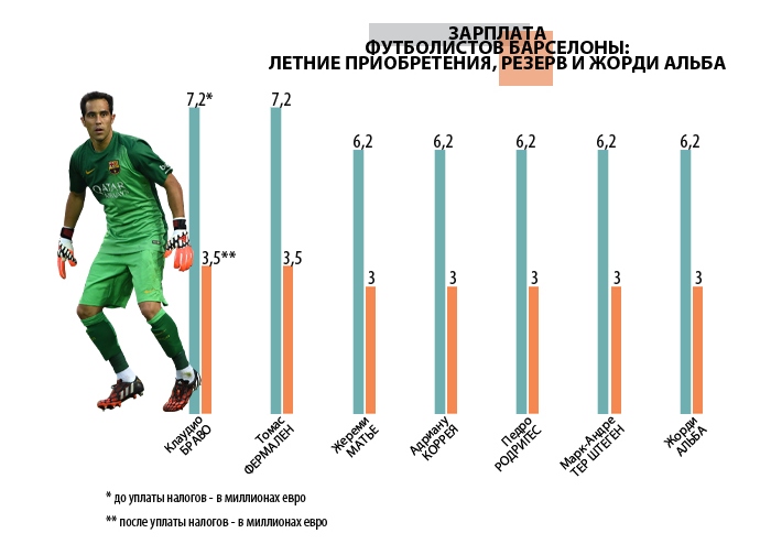 Сразу пять футболистов каталонского клуба (Жереми Матье, Адриану, Педро, Марк-Андре тер Штеген и Жорди Альба) зарабатывают 6,2 миллиона евро (3,2 - "чистыми"), и только фланговый защитник Альба из указанного списка имеет твердое место в стартовом составе команды Луиса Энрике.