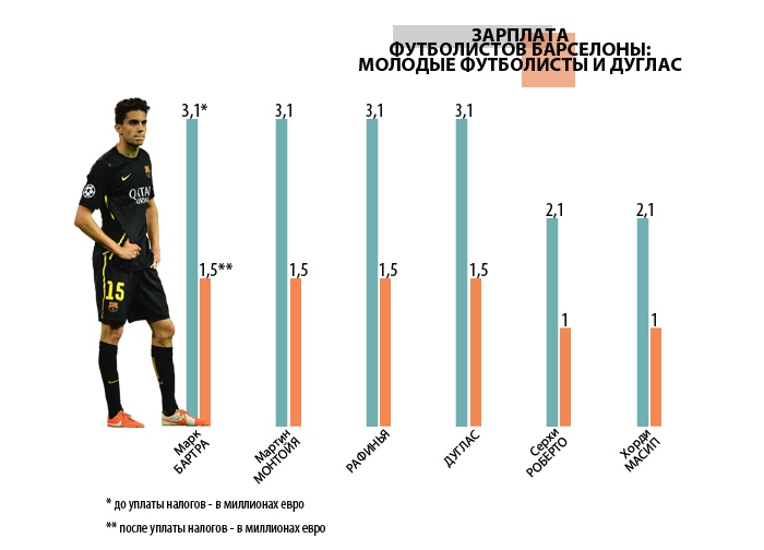 Наконец, в последней группе собрались молодые выпускники академии "Барселоны" (Марк Бартра, Мартин Монтойя, Рафинья, Серхи Роберто и Хорди Масип), находящиеся на подступах к основному составу сине-гранатовых, и бразильский новичок Дуглас: зарплаты футболистов здесь варьируются от 2,1 миллиона евро (1 миллион "чистыми") до 3,1 миллиона (1,5 миллиона после уплаты налогов).