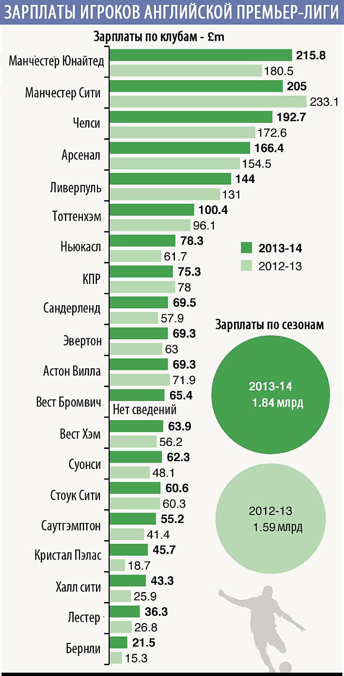 Совокупный оборот 20 клубов, выступающих в нынешнем сезоне в английской премьер-лиге, по итогам сезона-2013/14 достиг отметки в 3,07 миллиарда фунтов стерлингов (годом ранее сумма была куда скромнее - 2,3 миллиарда). Вырос и общий фонд заработной платы (темпы его роста, правда, куда скромнее): 1,84 миллиарда в сезоне-2013/14 по сравнению с 1,59 миллиарда в позапрошлом сезоне.