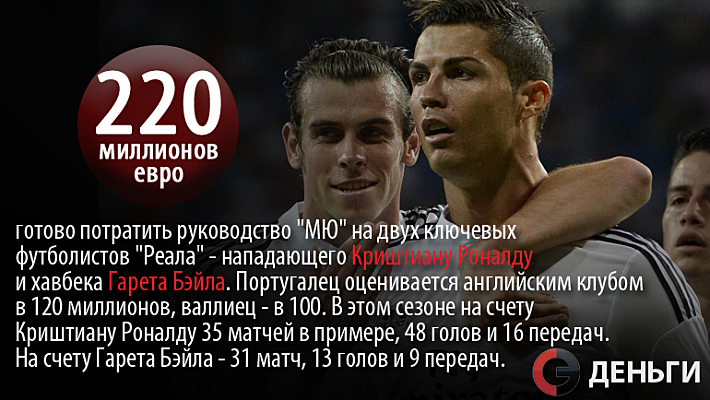 220 миллионов евро готово потратить руководство "Манчестер Юнайтед" на двух ключевых футболистов "Реала" - нападающего Криштиану Роналду и хавбека Гарета Бэйла.