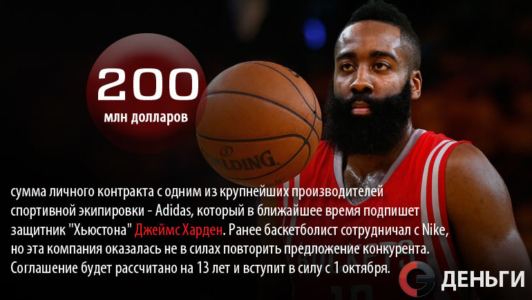 200 миллионов долларов - сумма личного контракта с одним из крупнейших производителей спортивной экипировки - Adidas, который в ближайшее время подпишет защитник "Хьюстона" Джеймс Харден.