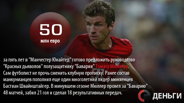 50 миллионов евро за пять лет в "Манчестер Юнайтед" готово предложить руководство "Красных дьяволов" полузащитнику "Баварии" Томасу Мюллеру.